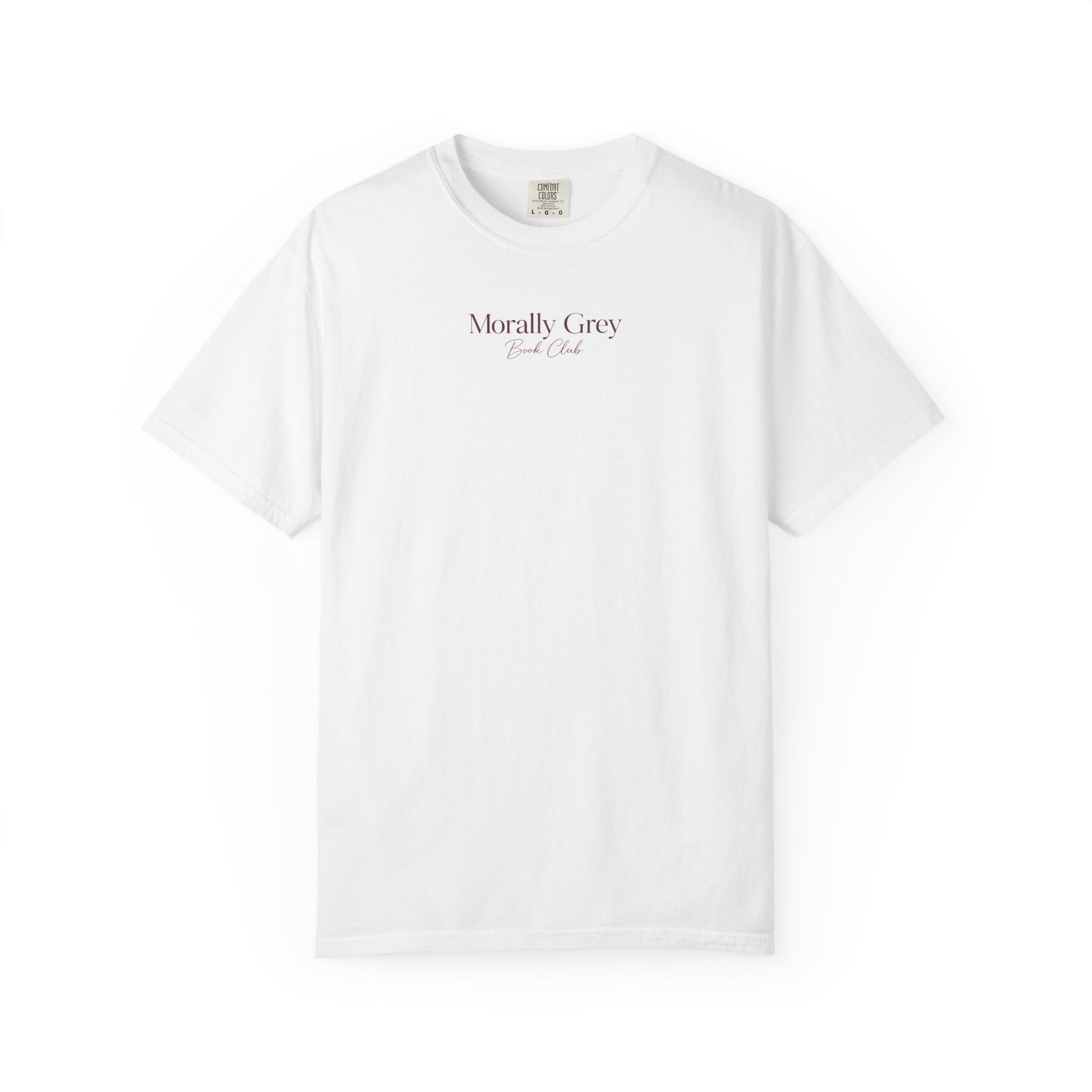 The Morally Grey Book Club Tee was designed for readers who love complicated characters, slow burns, and questionable decisions. Featuring an ultra-minimal serif “Morally Grey” with a delicate script “Book Club” beneath, this piece blends quiet luxury with bookish edge.